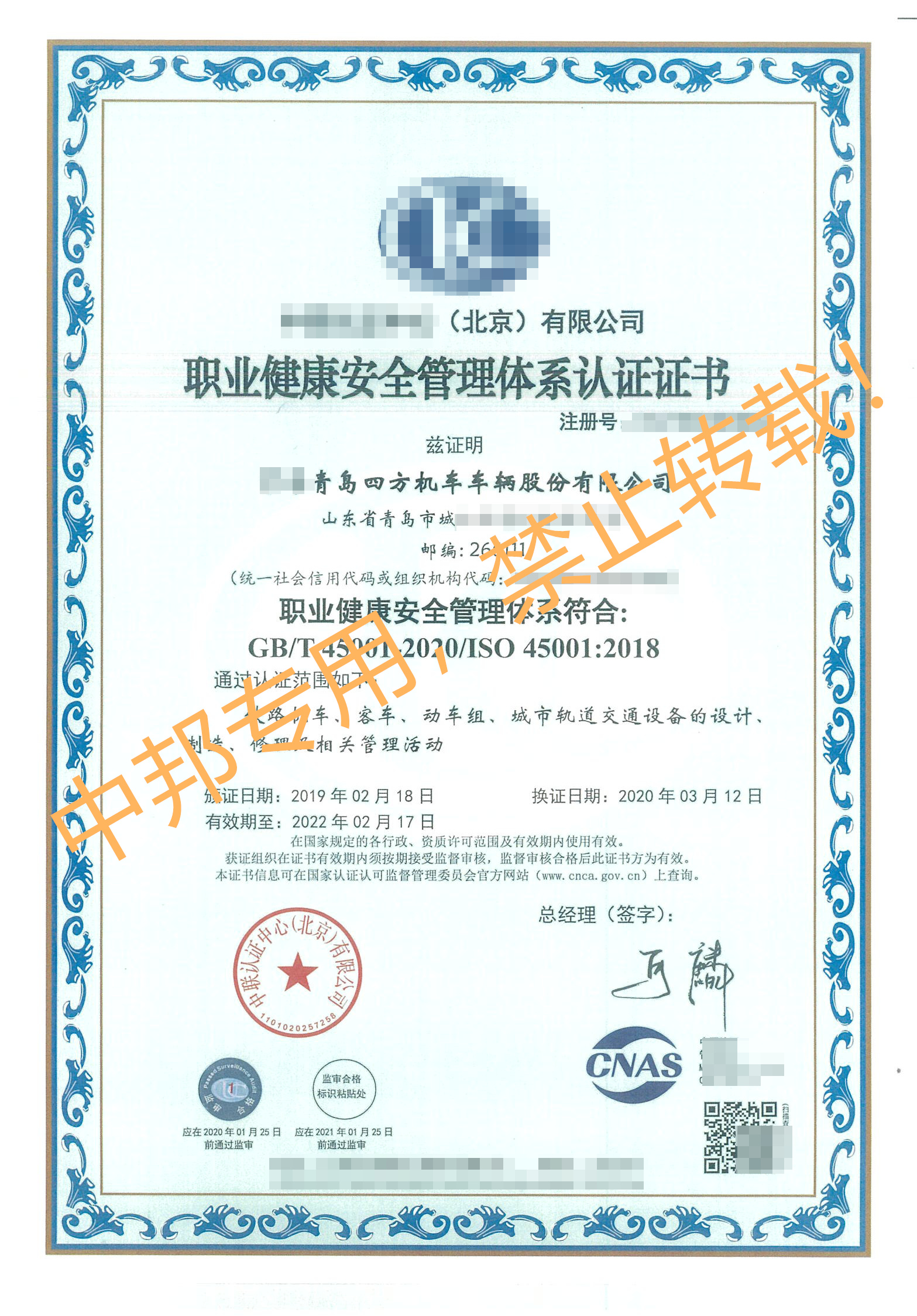 恭贺XX青岛四方机车车辆股份有限公司2019年2月顺利通过ISO三体系认证